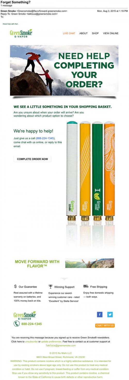 Email from Green Smoke sent after a product was left in the online shopping cart of the brand website, offering assistance in completing the order.