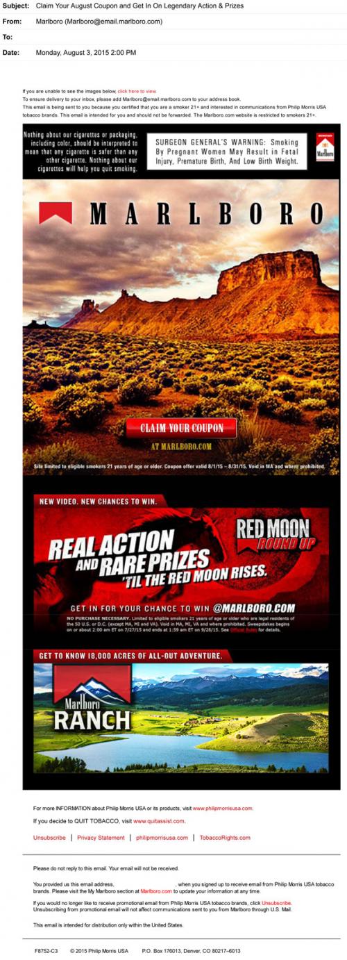 Marlboro email from August 2015 inviting the recipient to claim their monthly coupons and participate in the Red Moon Roundup sweepstakes on the brand website.