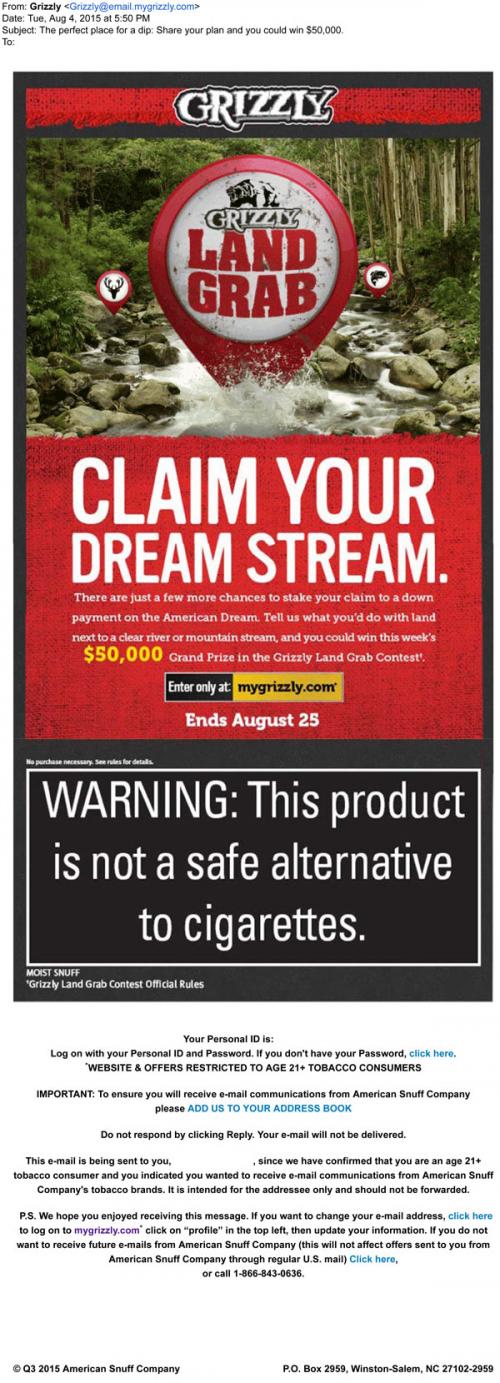 Email from Grizzly in August 2015 inviting the recipient to "claim your dream stream" in the latest week of the Land Grab sweepstakes.