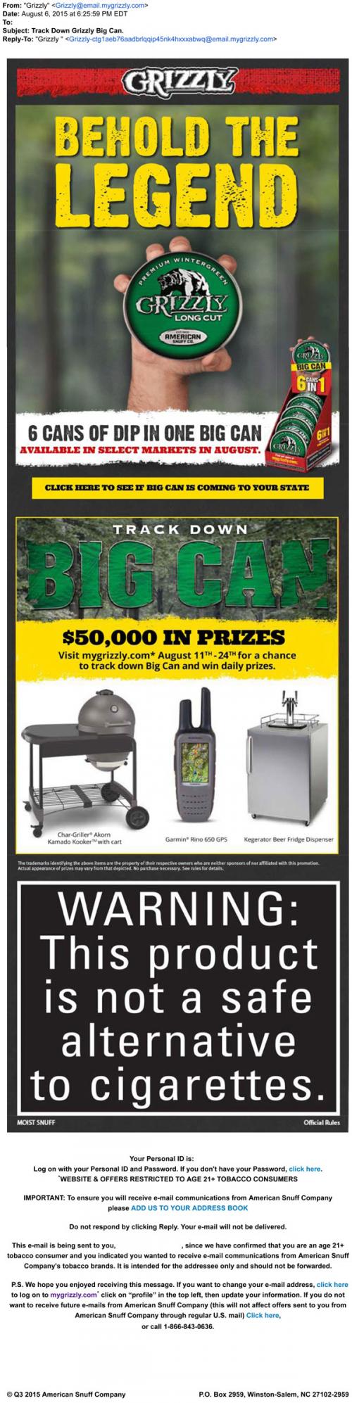 Email from Grizzly in August 2015 to promote their new Big Can, which holds 6 cans worth of dip in one can and will be available in select markets. Part of the promotion is an interactive search of the brand website to "track down Big Can" and win daily prizes.