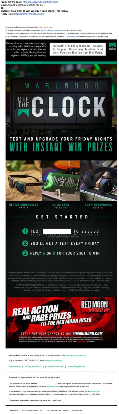 Marlboro email from August 2015 promoting the Off the Clock and Red Moon Roundup sweepstakes.