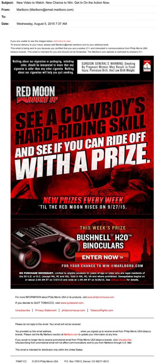Marlboro email in August 2015 promoting the Red Moon Roundup weekly video and associated prize on the brand website.