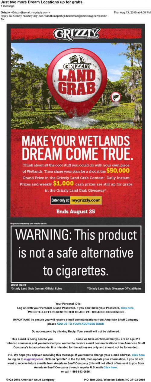 Reminder email from Grizzly in August 2015 to enter the most recent week of the Land Grab sweepstakes.