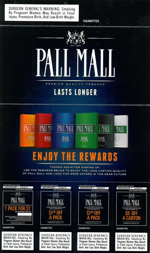 Direct mail from Pall Mall delivering coupons as a thanks for signing up on the brand website. Received August 2015.