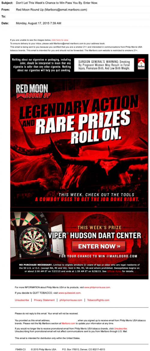Marlboro email promoting the Red Moon Roundup sweepstakes and this week's prize, with a link to the brand website to enter.