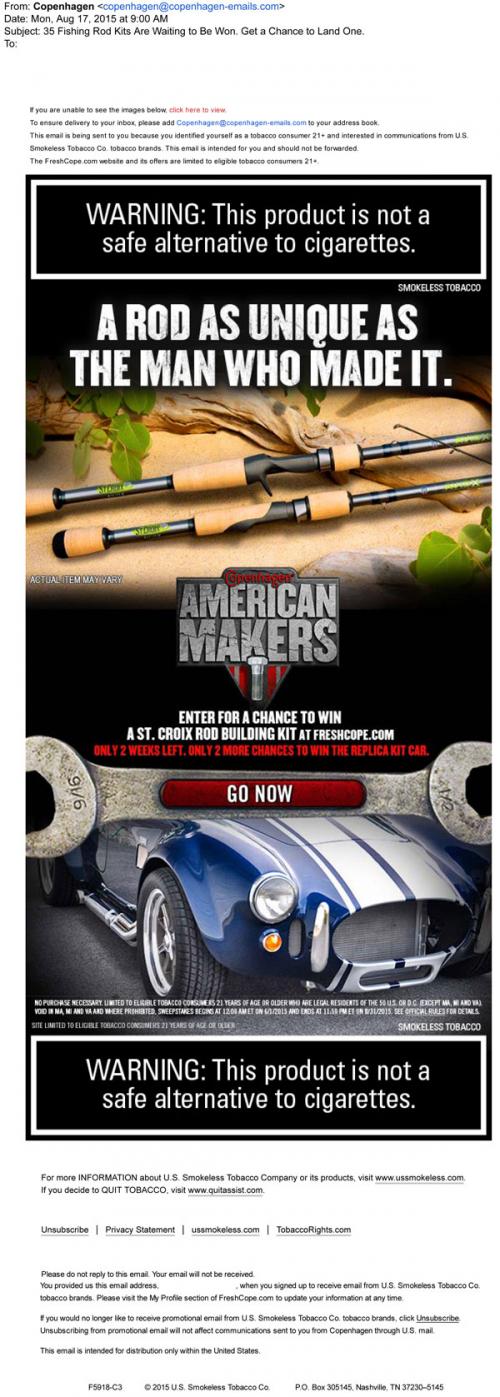 Email from Copenhagen sent in August 2015 announcing the next round of the American Makers sweepstakes, where participants have the chance to win a fishing rod building kit. Text: "A rod unique as the man who made it."