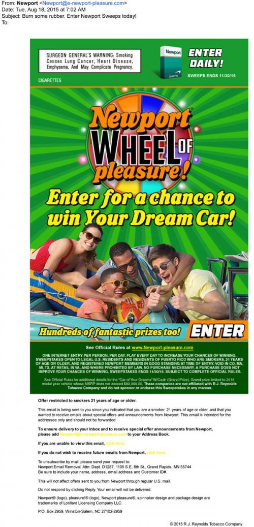 Newport email in August 2015 promoting the Wheel of Pleasure sweepstakes, where visitors to the brand website can enter to win daily.