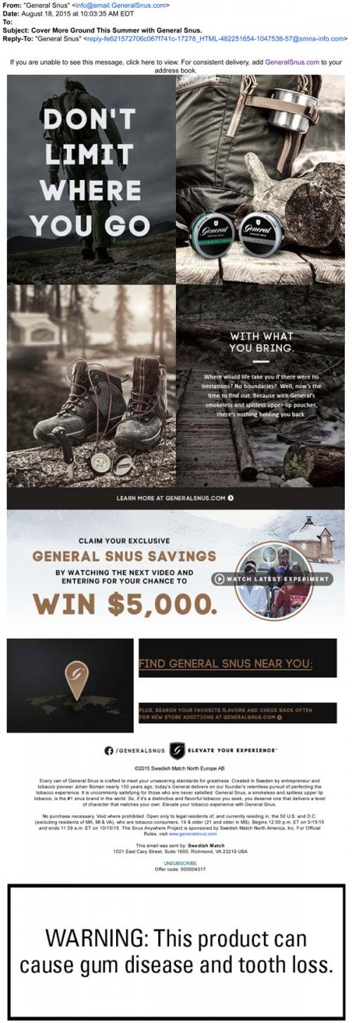 General Snus email from August 2015 promoting the no limitations and no boundaries associated with using their products. Includes a link to participate in the Snus Anywhere sweepstakes at the brand website and claim coupons, as well as a store locator. Text: "Don't limit where you go with what you bring."