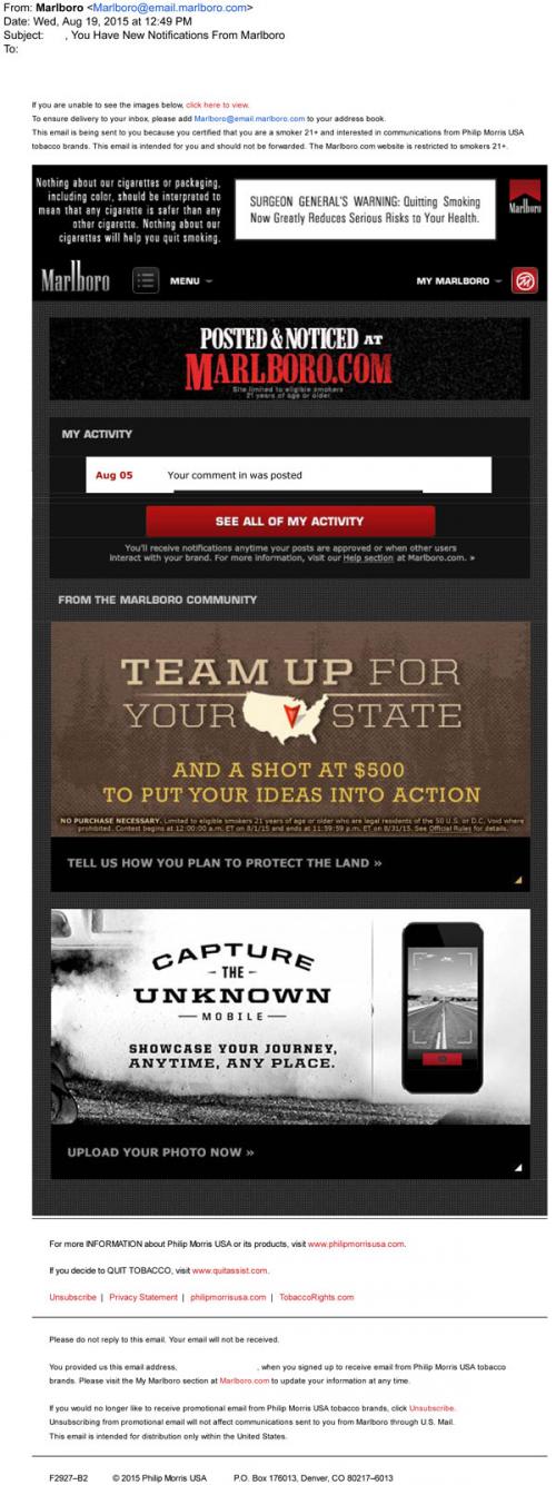 Email from Marlboro in August 2015 confirming that a user's comment has been posted on the brand website. Includes promotion for other online interactive activities like Team Marlboro and the Capture the Unknown photo gallery.