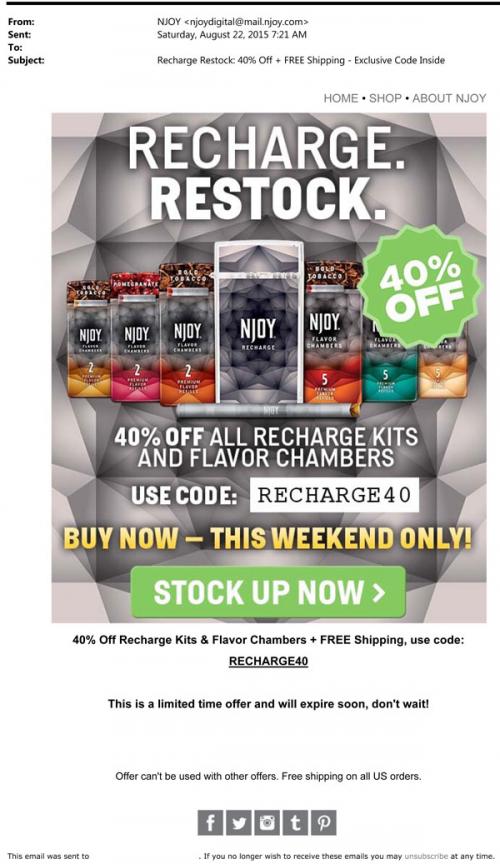 NJOY email from August 2015 with a discount code for rechargeable kits and cartridges purchased on the brand website.