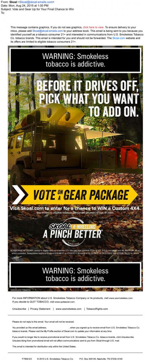 The 4-Wheeling sweepstakes at the Skoal brand website invites members to vote on a gear package for the 4x4 for their chance to win in August 2015.