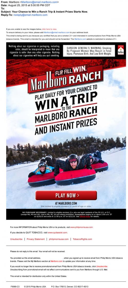 Marlboro email in August 2015 promoting the daily entry for a chance to win a trip to the Marlboro Ranch, and other instant prizes, on the brand website. Participants flip a card to make a match with a card in their digital deck; the cards have images of different winter sports and activities.