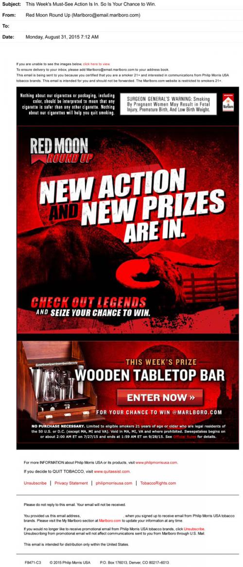 Red Moon Roundup email from Marlboro in August 2015 featuring the recent weekly prize available.