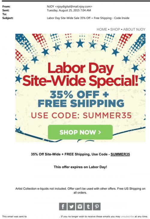 Labor Day site-wide sale announcement via email from NJOY in August 2015.