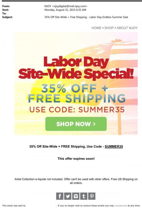 Labor Day site-wide sale announcement via email from NJOY in August 2015.