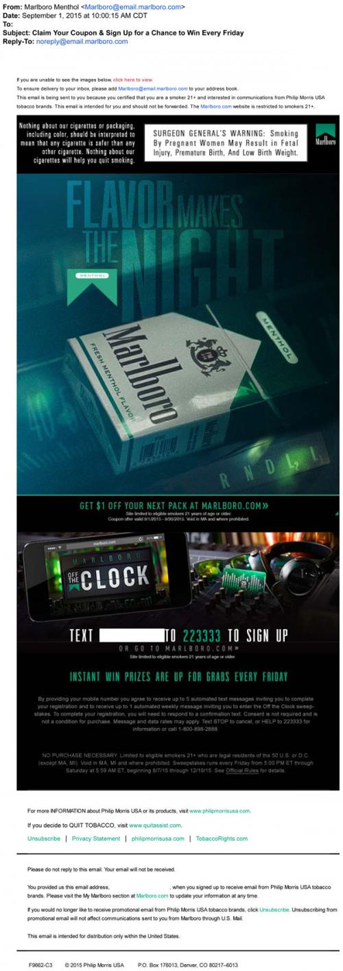 Marlboro menthol email from September 2015 linking to coupons on the brand website and promoting the Off the Clock sweepstakes, a game that requires entries made via mobile device to win.