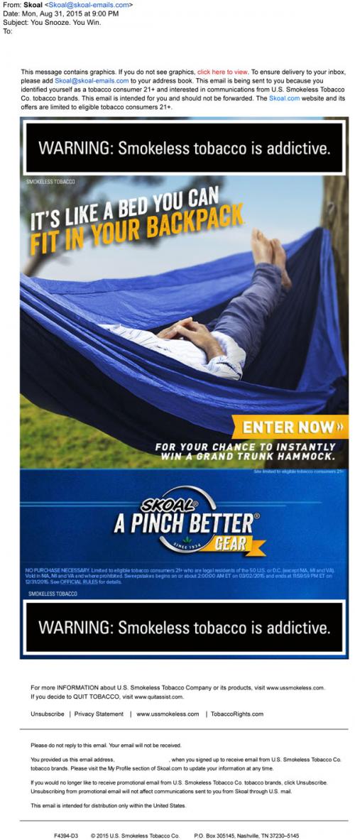 Skoal email from August 2015 promoting a chance to win a hammock as part of their ongoing gear giveaway, with a link to the brand website to enter.