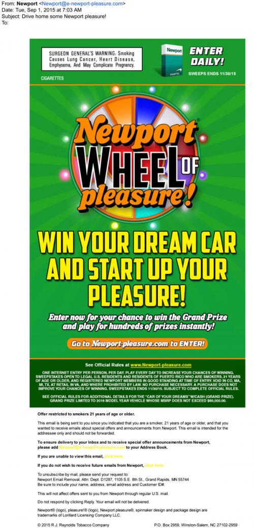 Email from Newport in September 2015 promoting the Wheel of Pleasure sweepstakes: "Win your dream car and start up your pleasure!"