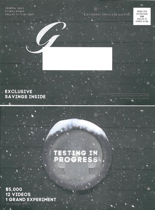 Direct mail from General Snus in August 2015 containing coupons and promoting the Snus Anywhere sweepstakes. Contains some details about past and future "scenario" testings that they have featured on the brand website. Also lists some retail locations to purchase their products.