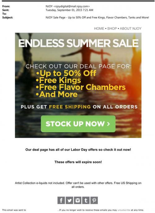 NJOY email promoting an Endless Summer Sale in September 2015, where customers on the brand website can get 50% discounts on products as well as free cartridges with their purchase.