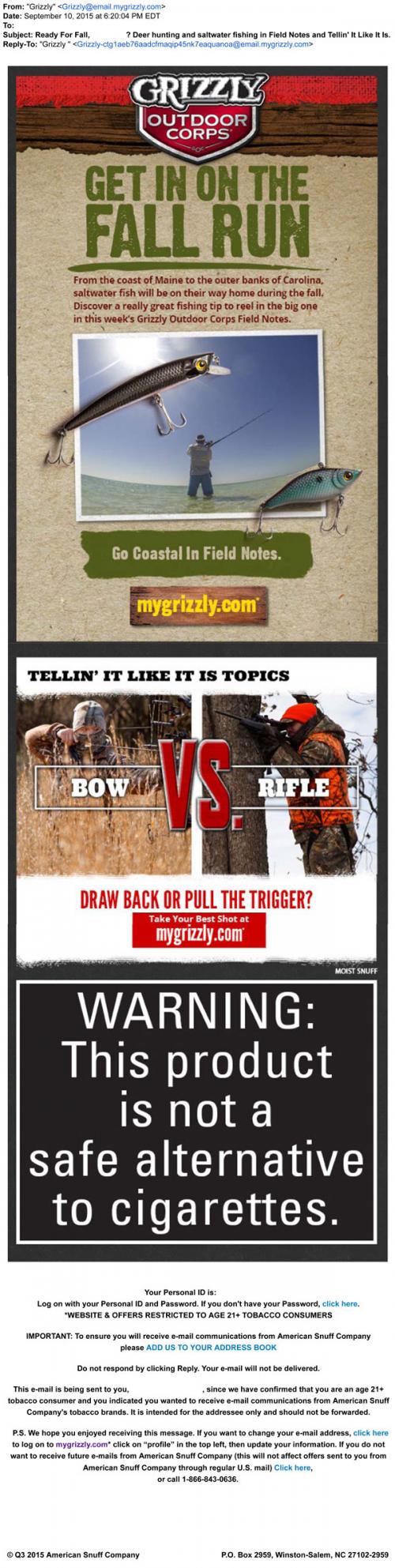 September 2015 email from Grizzly featuring an Outdoor Corps Field Notes article on fall saltwater fishing tips, and a link to participate in the recent "Tellin' it like it is" topical conversation about hunting bows vs. rifles on the brand website.