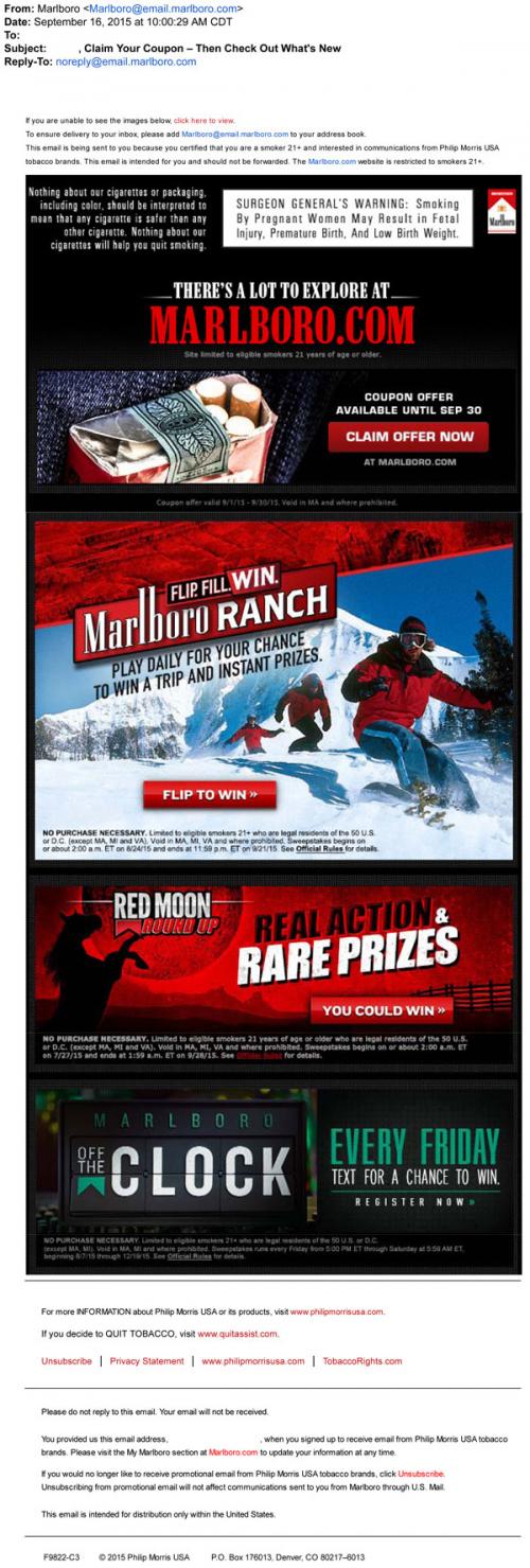 Email from Marlboro in September 2015 inviting the recipient to the brand website to claim coupons and enter in several current sweepstakes: the Flip to Win daily instant game, the Red Moon Roundup weekly game, and the Off the Clock Marlboro Menthol giveaways.
