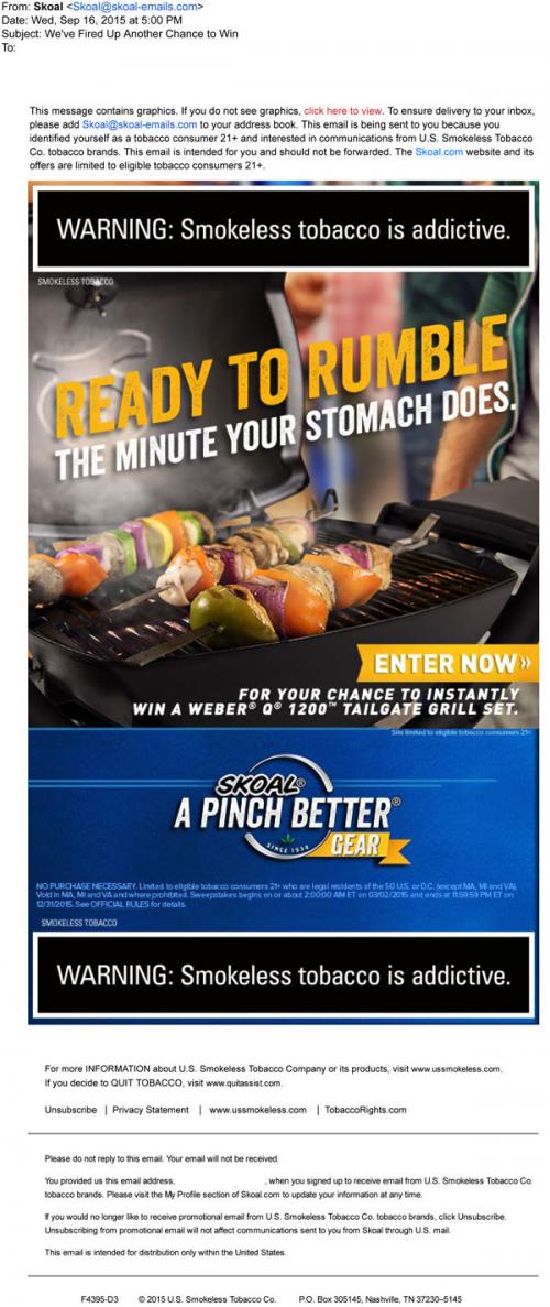 Email from Skoal in September 2015 featuring the recent prize available to win in the the Gear giveaway - a tailgate grill set. Invites the recipient to the brand website to enter.