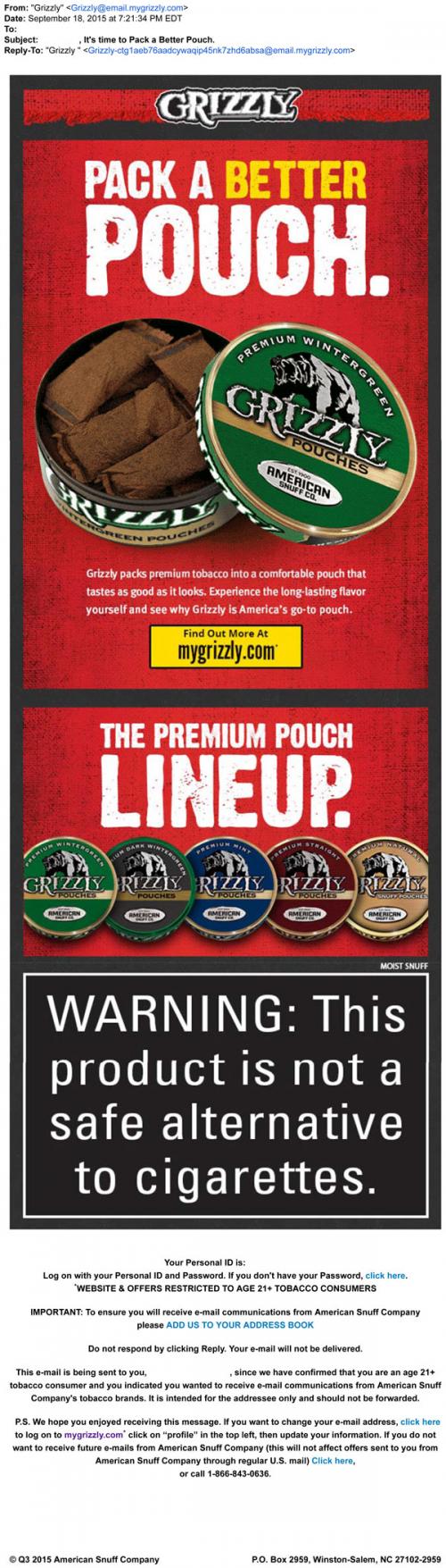 Email from Grizzly promoting their pouch smokeless tobacco products and linking to the brand website. Shows images of the different products with an animated GIF of a can opening to show the pouches. "Pack a better pouch."