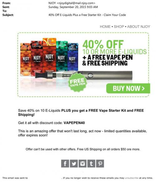 NJOY email from September 2015 with a promotion for a free vape pen with the purchase of 10 or more e-liquids from the brand website.