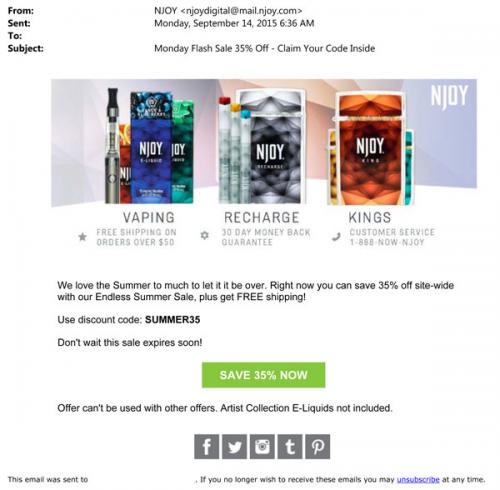 NJOY email from September 2015 promoting their Endless Summer sale with another discount code. "We love the Summer to [sic] much to let it be over."
