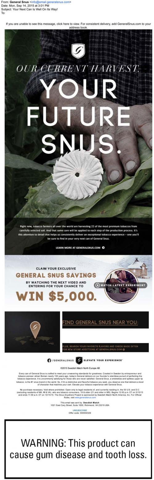 Email from General Snus in September 2015 featuring the story of their growing and production process, linked to on the brand website. Also promotes the Snus Anywhere sweepstakes and links to a retail locator.