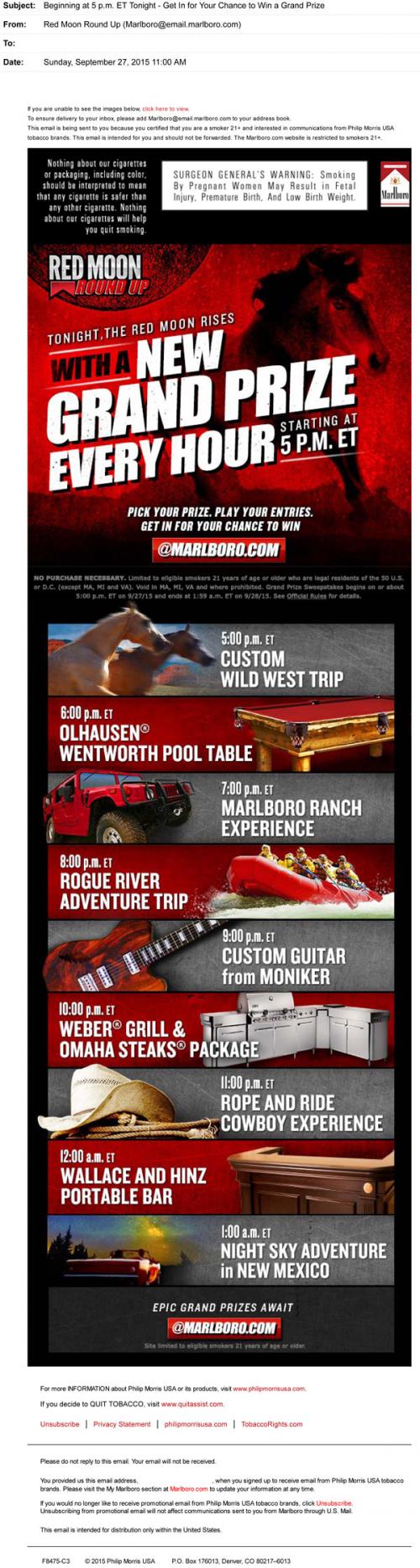 Email from Marlboro in September 2015 for the end of the Red Moon Roundup sweepstakes. Explains the grand prize giveaway and guidelines for participating on the brand website.