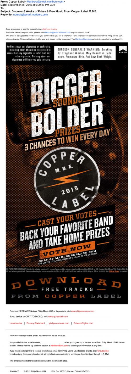 Marlboro email in September 2015 promoting the Copper Label sweepstakes, where participants can vote in the battle of the bands and win prizes. Also includes a link to the brand website to download free music tracks.