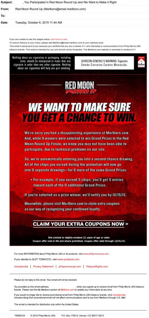 Marlboro follows through with their apology for technical issues on the brand website during the end of the Red Moon Roundup sweepstakes in this email from October 2015. Non-winners in the event have been entered into a second chance drawing for grand prize opportunities. The email reminds the recipient to visit the brand website and claim extra coupons "as our way of recognizing your continued loyalty."