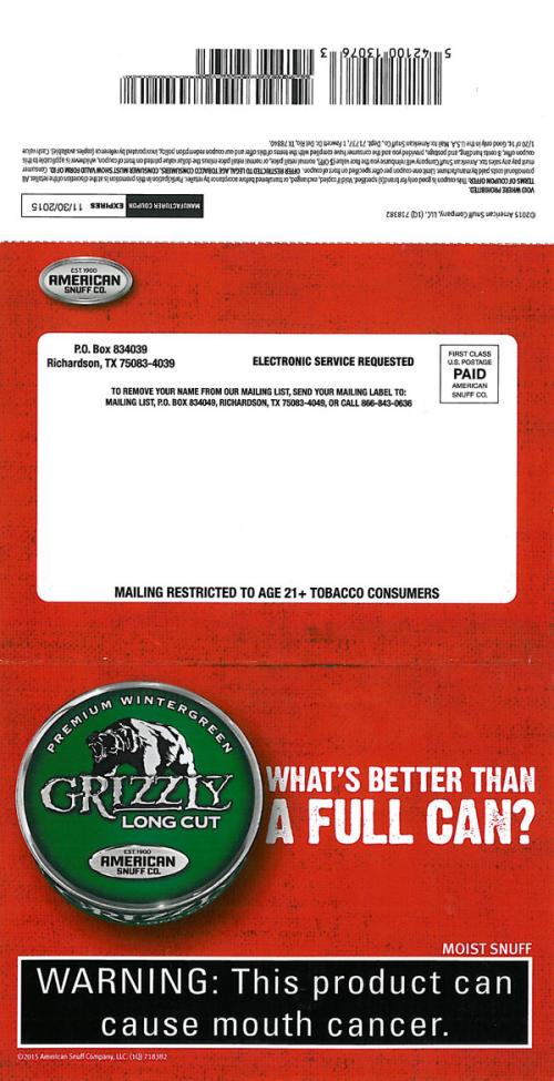 Direct mail received from Grizzly October 2015 containing a coupon. Text: "What's better than a full can? A full wallet."
