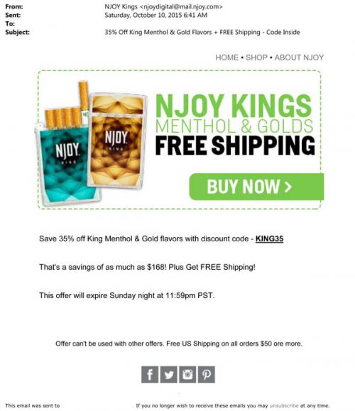 NJOY email in October 2015 with a discount code for the Kings menthol and gold flavor products, for use on purchases made from the brand website.