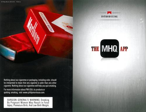 Direct mail from Marlboro promoting the new MHQ mobile app where participants can get instant coupons, exclusive promotions and more. The mailer unfolds to describe how the app works and where to downloaded it.