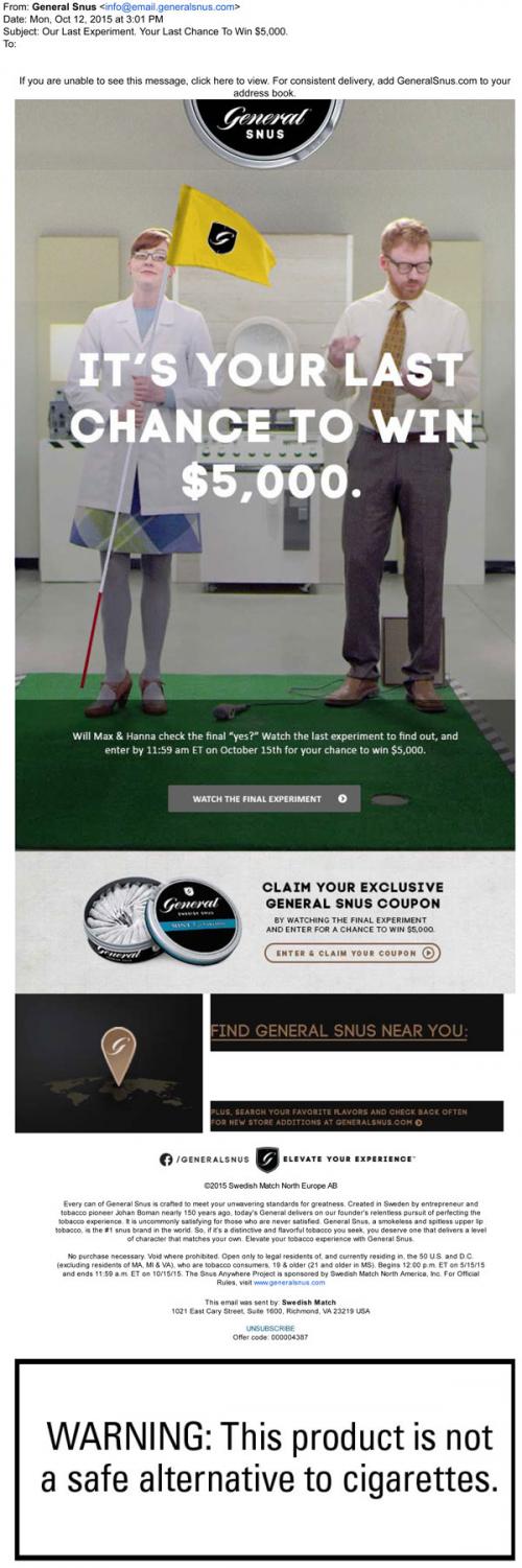 Email from General Snus in October 2015 announcing the final round of the Snus Anywhere sweepstakes and the last chance to win. Includes links to claim coupons and find a retail location on the brand website.