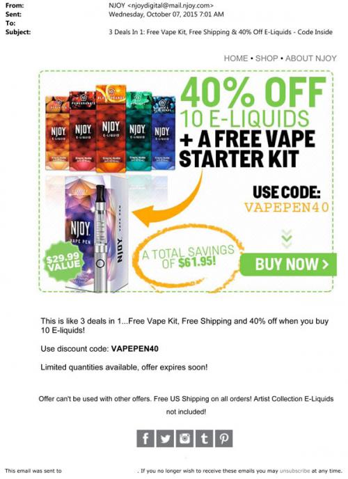 NJOY email from October 2015 promoting a discount off the purchase of 10 flavored e-liquids and including a free vape starter kit, when using the code on the brand website.