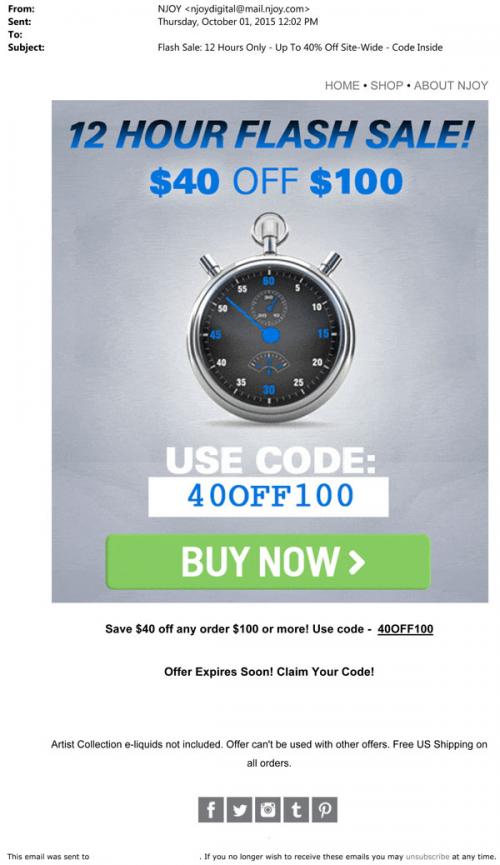 NJOY email promotion from October 2015 announcing a 12 hour flash sale where customers can get 40$ off of a 100$ purchase on the brand website.