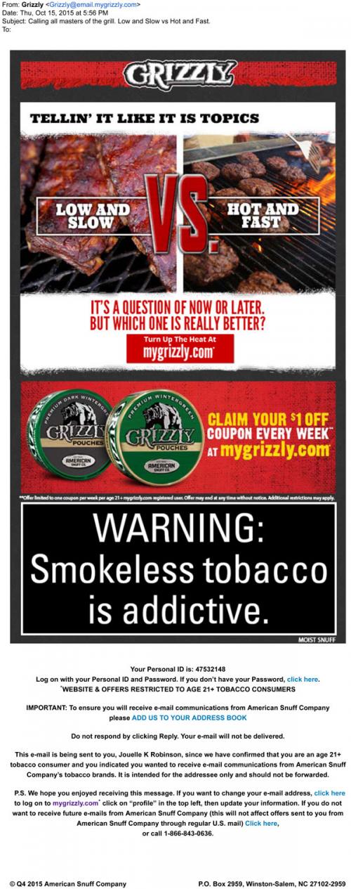 Grizzly email in October 2015 featuring the week's "Tellin' it like it is" discussion topic, grill methods, and a link to claim the weekly coupon offer on the brand website.