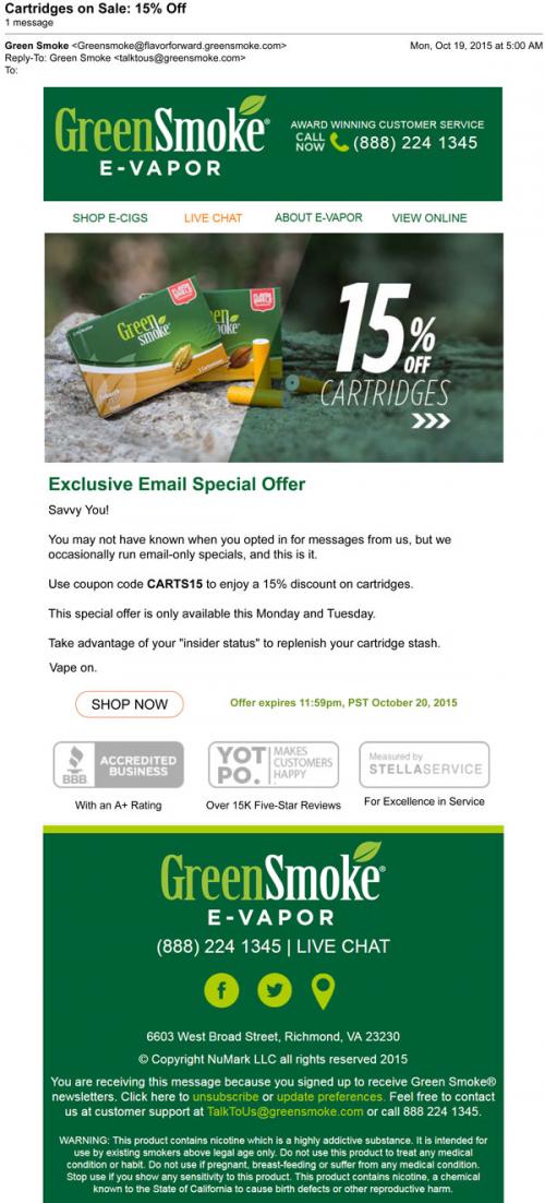Green Smoke email from October 2015 promoting a sale on cartridges at the brand website.