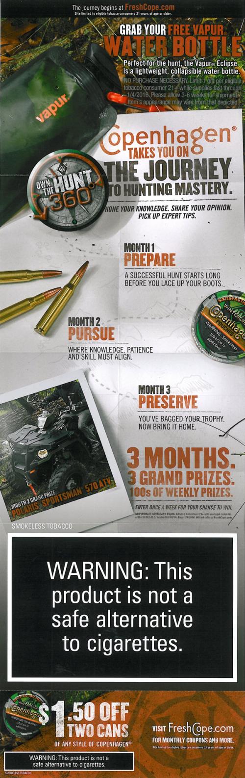 Direct mail from Copenhagen in October 2015 promoting the new Own the Hunt 360 sweepstakes and delivering a coupon. The mailing features a free water bottle to claim on the brand website as part of the promotion, and describes the sweepstakes and how to enter weekly to win.