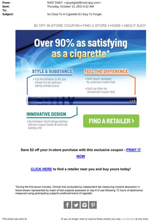 Email from NJOY in October 2015 promoting the Daily disposable e-cig product. Claims include that it is "over 90% as satisfying as a cigarette" and a graphic identifies major product features. Also provides links to the brand website to find a retailer and print out a coupon for in-store purchases.