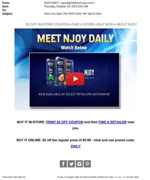 NJOY email from October 2015 featuring a video that introduces the NJOY Daily product. Also links to a coupon that can be printed and used in stores, or a discount code for savings on the brand website.