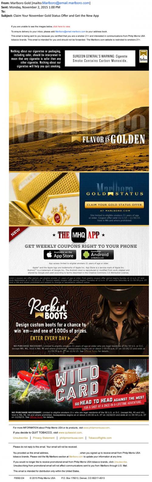 Marlboro Gold email from November 2015 letting the recipient know that there are coupons available on the brand website. Links to the MHQ app to receive weekly coupons on your mobile phone. Also promotes the Rockin' Boots sweepstakes and the Wild Card prize game.