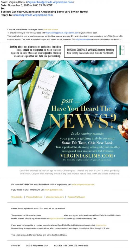 Virginia Slims email from November 2015 featuring an announcement about the "style revamp" for their product packaging. Also invites the recipient to the brand website to request monthly coupons.