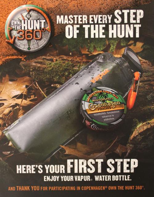 Copenhagen sent this Vapur water bottle in October 2015 as part of a promotion for the Own the Hunt 360 sweepstakes. Visitors to the brand website could request a bottle while supplies lasted. The bottle is meant to be useful on hunting trips because of its convenient and rugged design. Arrived in a plain green box with a card included thanking the recipient for participating and inviting them to the brand website to "stay engaged with other expert hunters."