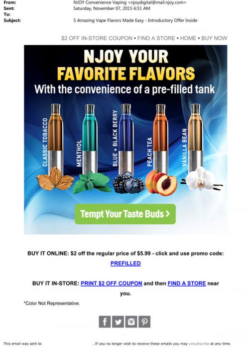 NJOY email from November 2015 inviting the recipient to "tempt your taste buds" with the flavor line up of pre-filled tanks. Includes links to use a promo code online or print a coupon for use in a store.
