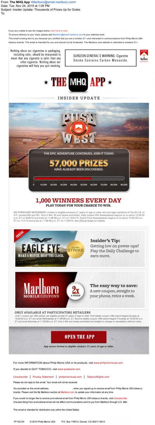 Marlboro email from November 2015 promoting the MHQ app and the various associated mobile games and coupon offers, like Push West and Eagle Eye. Contains a link to open the app directly from the email on a mobile device.